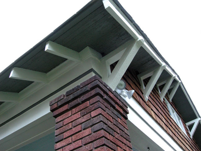 Here is a beautiful detail shot of the brackets on the front of the house. Previously the dark pink brackets blended in with the cedar shingles. Now the white brackets against the “Link Grey” colored roof decking by the cedar shingles has a nice, bold contrast.