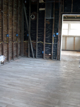 Where the back bedroom had floor damage (from the adjacent bathroom) we had salvaged kitchen floor to put in place. Hopefully the color difference will be fixed once the floors are redone.